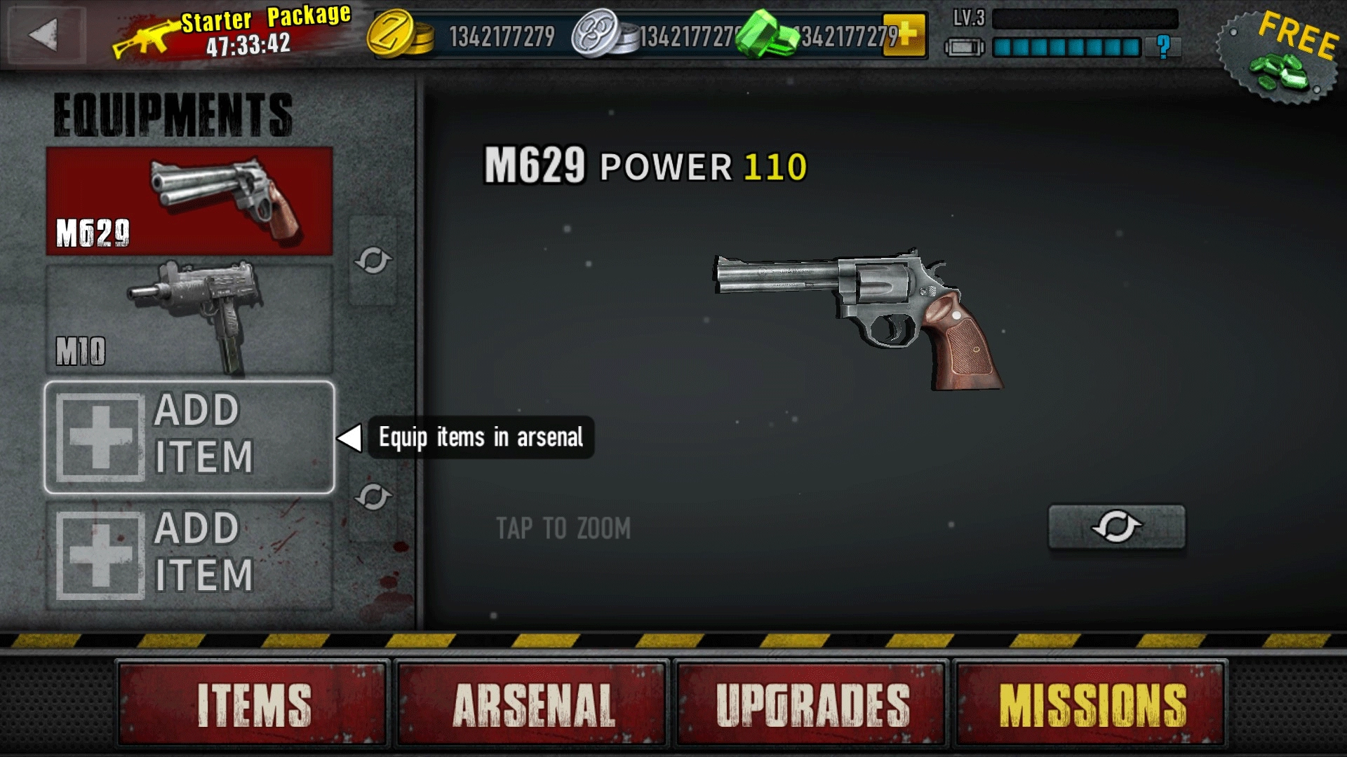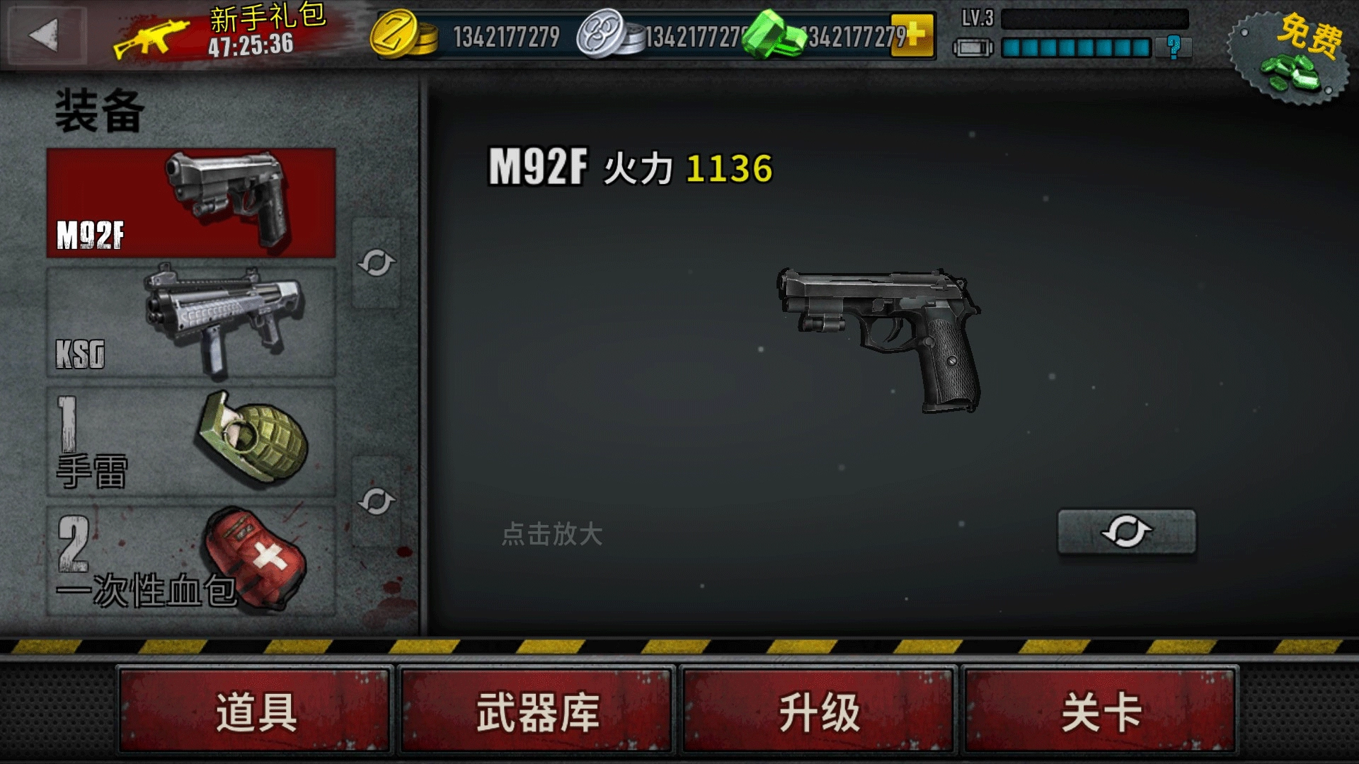1. 在主界面,点击“开始游戏”,随后挑选关卡中要使用的武器与道具,还能点击“升级”来提升枪械等级。