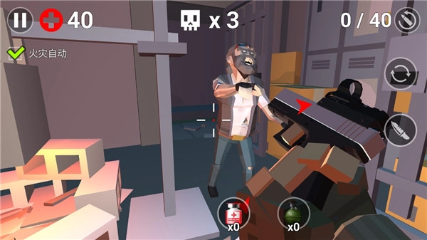 总结:基本的操作了解之后,关于游戏界面的其他功能,如图中绘制一样,从左到右,依次是自动点火开关、骷髅头是僵尸数量,右边是装弹、换武器、近身刀战等按键,下方则是医药品、手榴弹的道具展示。