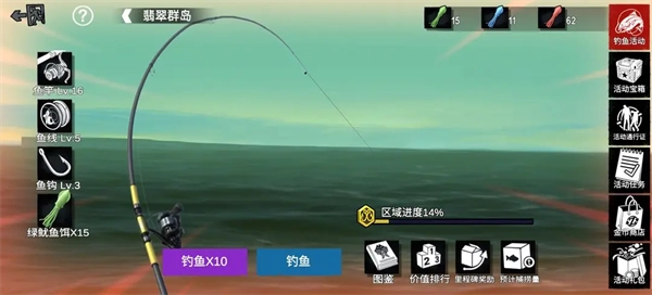 当你装备好鱼竿、鱼线、鱼钩以及鱼饵,就能够开启钓鱼活动啦。需要注意的是,使用不同的鱼饵,钓起橙色和红色鱼的概率是不一样的哦。目前总共探测到了89种鱼类品类,其中属于高级品质(橙色和红色)的就有36种呢。当你进行5次钓鱼操作之后,就可以解锁十连钓这种玩法咯。