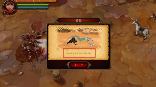 3、双击屏幕进行翻滚动作,点击下一个继续教程。
