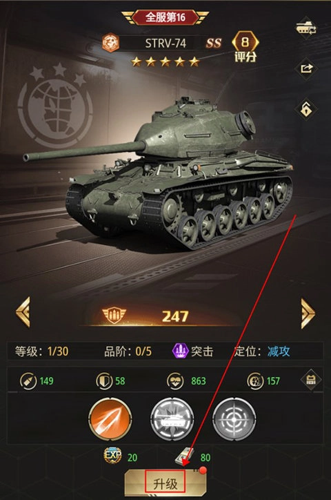 1、玩家可以对坦克进行升级,提升等级,解锁更多技能,提升坦克基础战力。