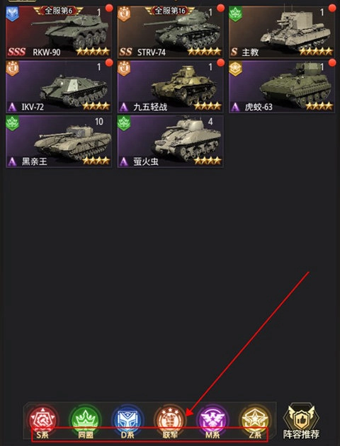 1、游戏中包含S系、同盟、D系、联军、M系、Z系这六大坦克阵营类别,每一种坦克皆具备自身独特的特性。