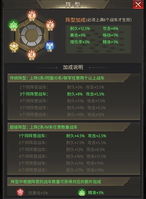 4、阵营之间还有羁绊加成,玩家可以通过上阵坦克激活阵营羁绊,增加更多属性加成。