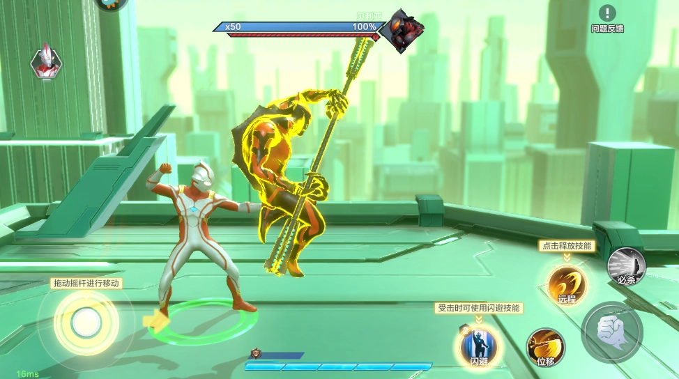 4. 通过左侧的虚拟摇杆能够操控奥特曼移动,而右侧的按钮则用于释放技能。