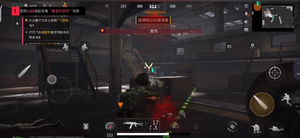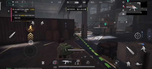 3、会随机在某个场景出现,通过左下角的方向盘操控移动,右下角的按键用于射击、跳跃、蹲下等操作。