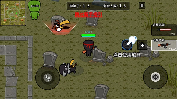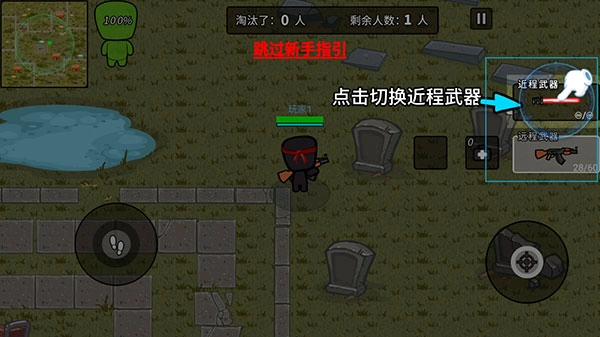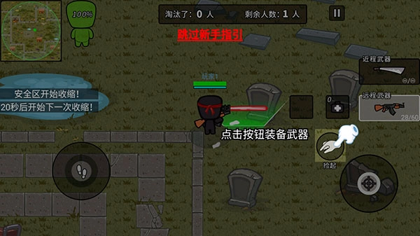 3、降落到地面,左边摇杆拖动控制角色移动,上方小地图绿色圈内为安全区,圈外为中毒区域;